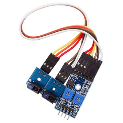 Set consisting of two TCRT5000 reflection sensors and a small management board based on the LM393 chip. When a light-colored object approaches, the signal intensity received by infrared reflective sensor increases and the indicator LED on board turns red. When a dark-colored object approaches, the intensity decreases and the LED turns off.