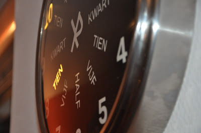 Let’s say it’s five o’clock, the 5 and the ‘UUR’ (hour) are illuminated. Ten past five, the 5 and the ‘TIEN’ (ten) in the upper right quadrant is illuminated. Note there are more ‘TIEN’s on this clock. The location of the word also has a meaning. Perhaps another example makes this a bit more clear. In Dutch we say when it’s 05:50 that it’s ‘tien voor 6’ (TEN to 6). So, at 05:50 the number 6 is illuminated and the ‘TIEN’ in the top left quadrant.
