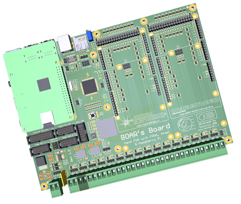 The board includes one Raspberry socket, two Arduino Mega shield-compatible sockets, one CPU and one FPGA, all connected together in order to make it quickly and easily usable for many different applications.