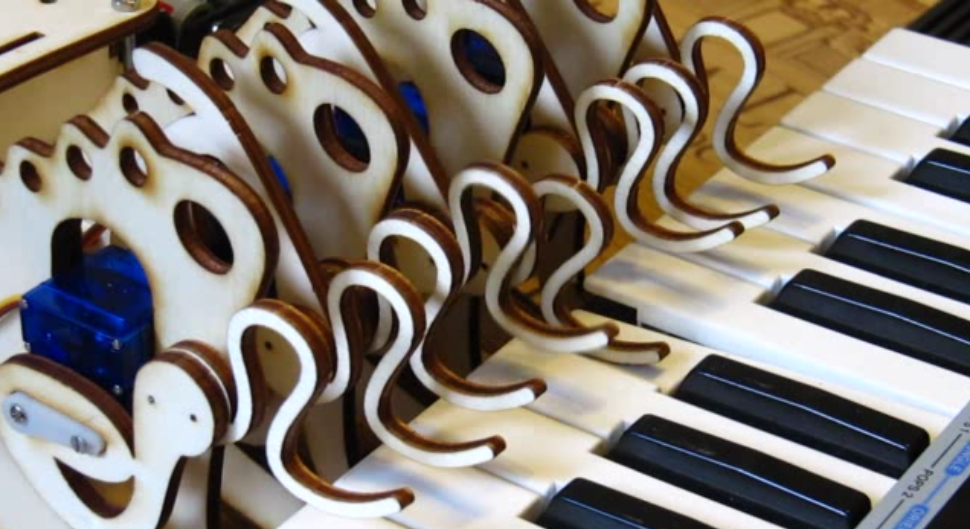 The MIDI sequence/notes to be played are supplied by a computer running Advanced Linux Sound Architecture (ALSA), and interpreted by a C program that translates it into USB serial signals that the Uno can use. It then actuates its wooden fingers, producing a pleasing tune along with apparently keyboard-provided accompaniment in the video below.
