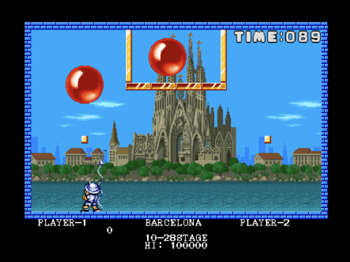 Programmed by Mitchell and distributed by Capcom, Pang was first released as an arcade game in 1989, but was later ported to a whole host of home computers, including the ZX Spectrum, Amiga, and Commodore 64. The aim in Pang is to destroy balloons as they bounce around the screen, either alone or working together with another player, in increasingly elaborate levels. Destroying a balloon can sometimes also spawn a power-up, freezing all balloons for a short time or giving the player a better weapon with which to destroy balloons.