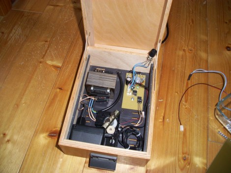 About the magnetic stirrer, the maker recycled the motor and gear system which used to move the tray in an old CDRom drive. He attached a metal bar to the drive gear and put some neodymium magnets on top. Everything is installed in a record card box. Right above this magnetic rotor is installed a “false floor” on top of which he put the glass vessel with the heating foil.