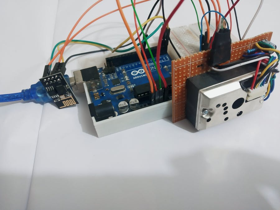 We use a Sharp gp2y1014au0f particle sensor which uses an IR LED and when the particle enters the sensor, the light bounces back to a photodetector. This technique is called laser diffusion. The intensity of the scattered (bounced) light depends on the dust particles. The more particles, the greater the bounce or dispersion. This change in light intensity on the photodetector changes the sensor output voltage that we can read.