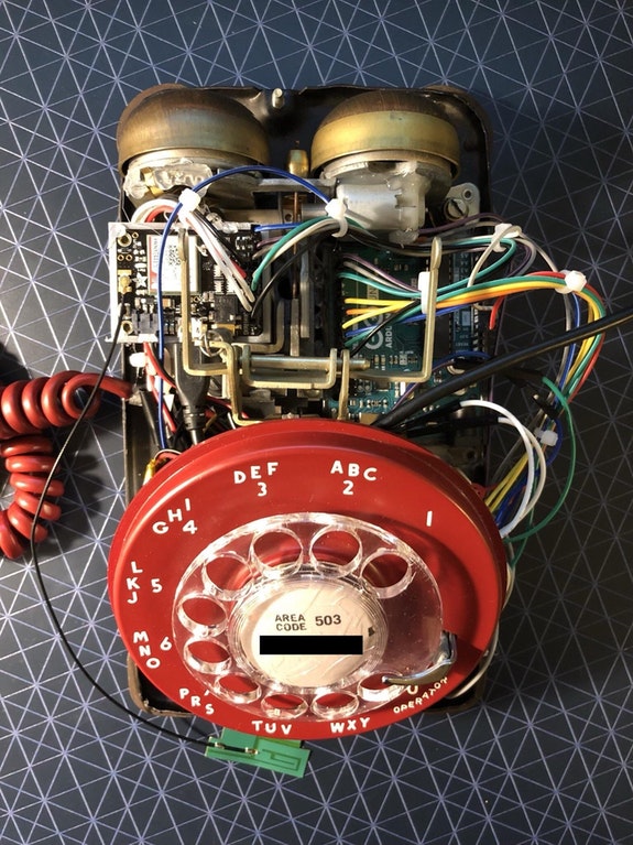 The Western Electric Model 500 includes a generous amount of space inside, enough room in fact for an Arduino Uno along with a tiny Adafruit FONA module for cellular capabilities.