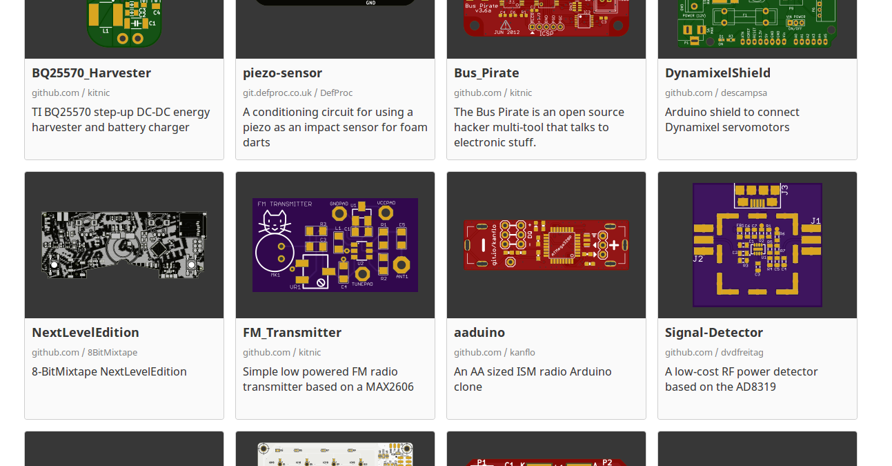 Kitnic is a registry of open hardware electronics projects that are ready for you to order and build. Click on any project to get further info, download the Gerbers and see the bill of materials!