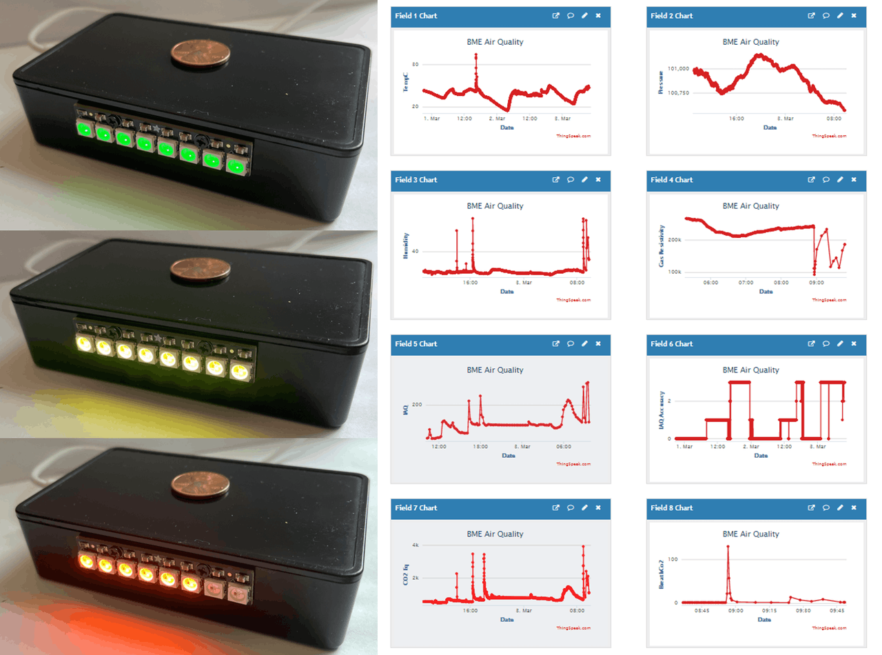 Having too many people in one room with poor ventilation can lead to unsafe conditions and an increased probability of sharing airborne viruses. With this instrument you can track the air quality and visualize historic trends.