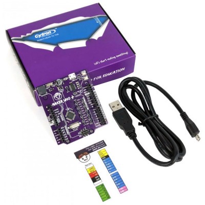 Maker UNO Plus is a development board compatible with Arduino UNO R3, an alternative and improved solution. Based on the ATmega328P, it has 12 LED (pin 2 to pin 13), 1 piezo buzzer (pin 8), 1 switch on/off for piezo buzzer, 1 programmable button (pin 2) and micro USB connector.