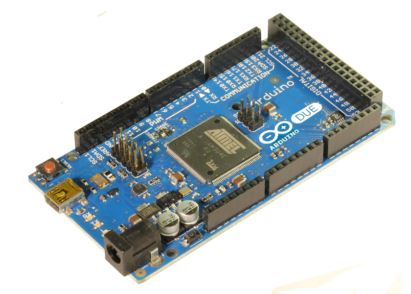 Arduino Due, a major breakthrough for Arduino because we’re launching an Arduino board with a 32bit Cortex-M3 ARM processor on it. We’re using the SAM3U processor from ATMEL running at 96MHz with 256Kb of Flash, 50Kb of Sram, 5 SPI buses, 2 I2C interfaces, 5 UARTS, 16 Analog Inputs at 12Bit resolution and much more.