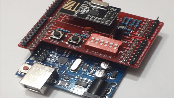 “This shield is the centrepiece of this campaign.  One hub shield can easily communicate with up to 64 other shields in the area by assigning slave addresses using the on-board 6-selector DIP switch.  The range is excellent, and you can even replace your NRF24L01+ with an NRF24L01+PA/LNA module.