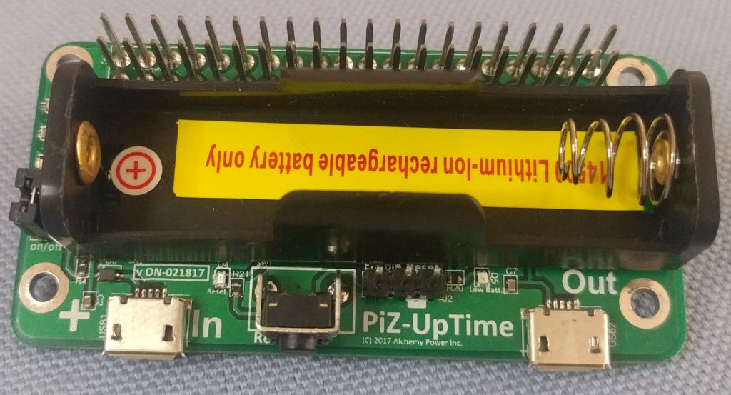 There are several UPS solutions for the Raspberry Pi on the market, but the latest Pi-Zero-UpTime (aka PiZ-UpTime) UPS boardfrom Alchemy Power looks particularly interesting since it comes in Raspberry Pi Zero size, relies on a standard 14500 Li-Ion battery, reports when battery level is low via GPIO 26, and works with an Raspberry Pi boards with a 40-pin header, as well as clones like Tinker Board, ROCK64, ODROID-C2, and others.