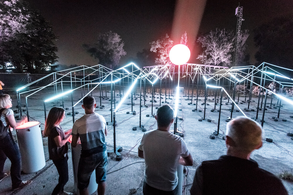 The interactive sculpture was comprised of 15 drums that trigger waves of light traveling toward a huge helium-filled sphere floating above the area, appearing to charge it with sound and light energy as the instruments are played.