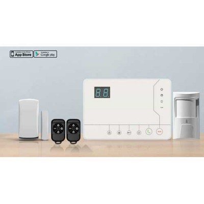 Wireless burglar alarm control unit can handle up to 32 zones for wireless sensors and 2 zones for wired sensors. Programmable via SMS and App for smartphones (iOS or Android), has GSM dialer quadriband, capacitive touch buttons, 2-digit LED display and rechargeble battery back-up. It can be stored up to 8 different user phone numbers, 3 phone numbers for administrator, 1 voice message with a maximum duration of 20 seconds and can be activ
