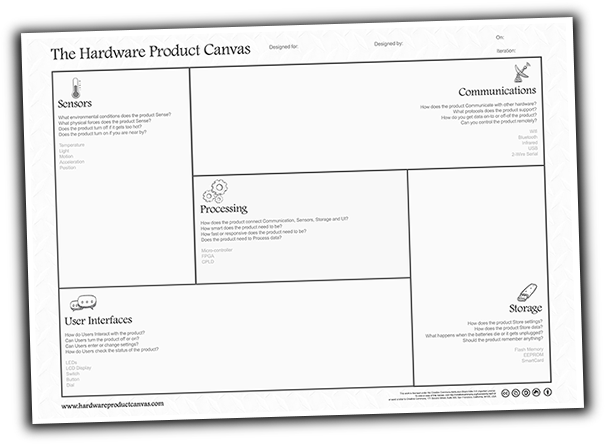 This is the Hardware Product Canvas. It’s a tool designed to help you get through the earliest stages of a hardware design. It’s open-source, creative commons, and totally hackable. We encourage you to take it, hack it and use it for your next hardware project or at your next hardware event.